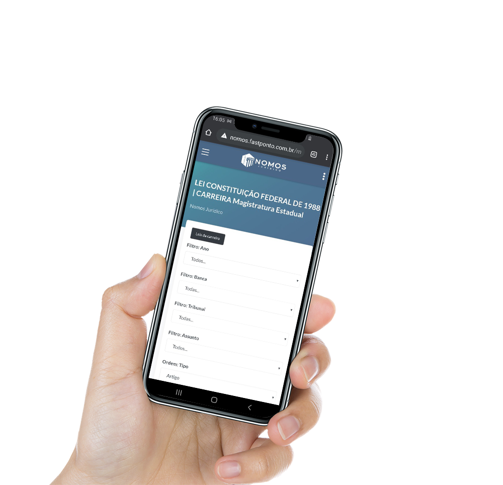 Você está a um passo de alavancar nos seus estudos para as provas objetivas de concursos públicos. Efetue sua assinatura optando pelo plano anual, semestral ou para ter acesso a todo conteúdo disponibilizado pelo Nomos Jurídico Isso te dará acesso ao conteúdo estatístico dos artigos mais cobrados, simulados e muito mais. Em nossa ferramenta de pesquisa, encontre os artigos mais cobrados do concurso almejado, filtrando por lei, ano, instituição e assunto. Serão listados todos os artigos com base em sua pesquisa e você terá acesso, após assinar o plano, aos enunciados de questões que já cobraram o teor daquele artigo estudado, que lhe ajudarão no entendimento da forma como o artigo estudado costuma ser cobrado pelas diversas bancas de concursos públicos. Não são incluídas Leis e Decretos Estaduais!!
